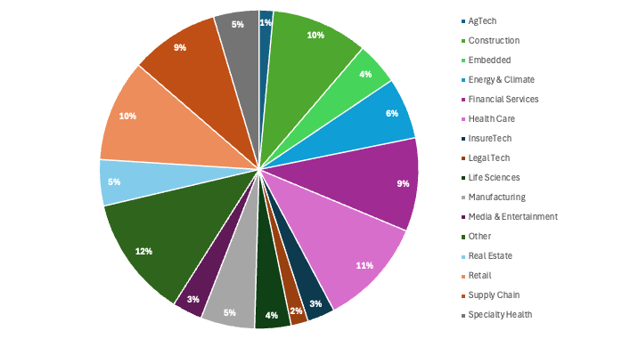 Double-clicking into the vertical Series A market, we broke out dollars invested by vertical to get a sense of where investor interest is concentrating. The largest five categories are Healthcare (11%), Construction (10%), Retail (10%), Supply Chain (9%), and Financial Services (9%).1