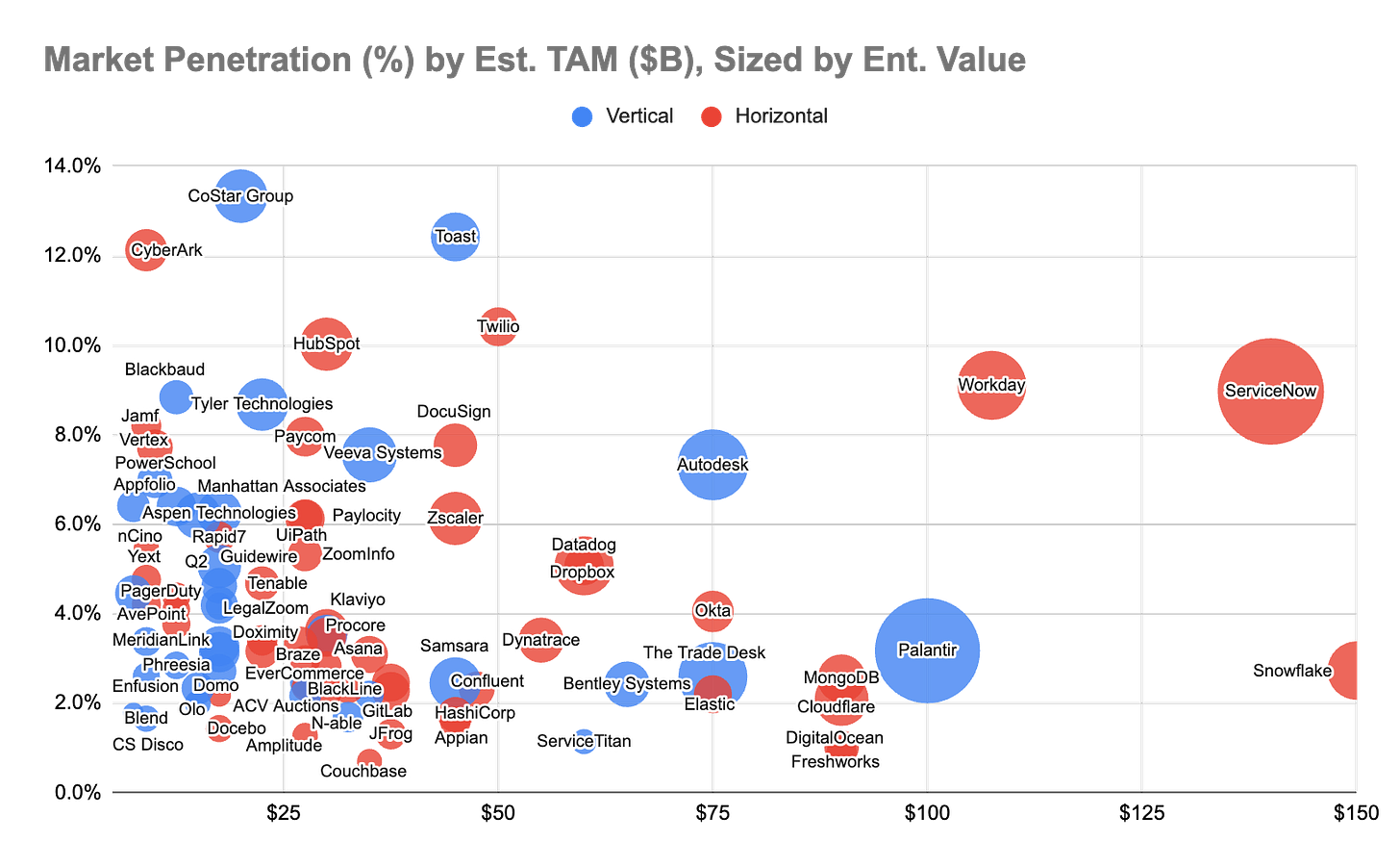 Off the bat, we see that the lower bound for TAM on a public software business seems to be about $5B. While the larger handful of bubbles on the right side may give the impression that mega-TAMs are dominant, there are an order of magnitude more businesses below the $100B estimated TAM line than above it. Across our dataset, 93% of TAMs are <$100B, 78% are <$50B, and >20% are $10B or lower. Another immediate finding is that vertical software companies appear no more TAM-constrained than horizontal peers: mean market size estimates are just ~10% larger for horizontals. Perhaps even more interestingly, penetration rates are about the same for both.