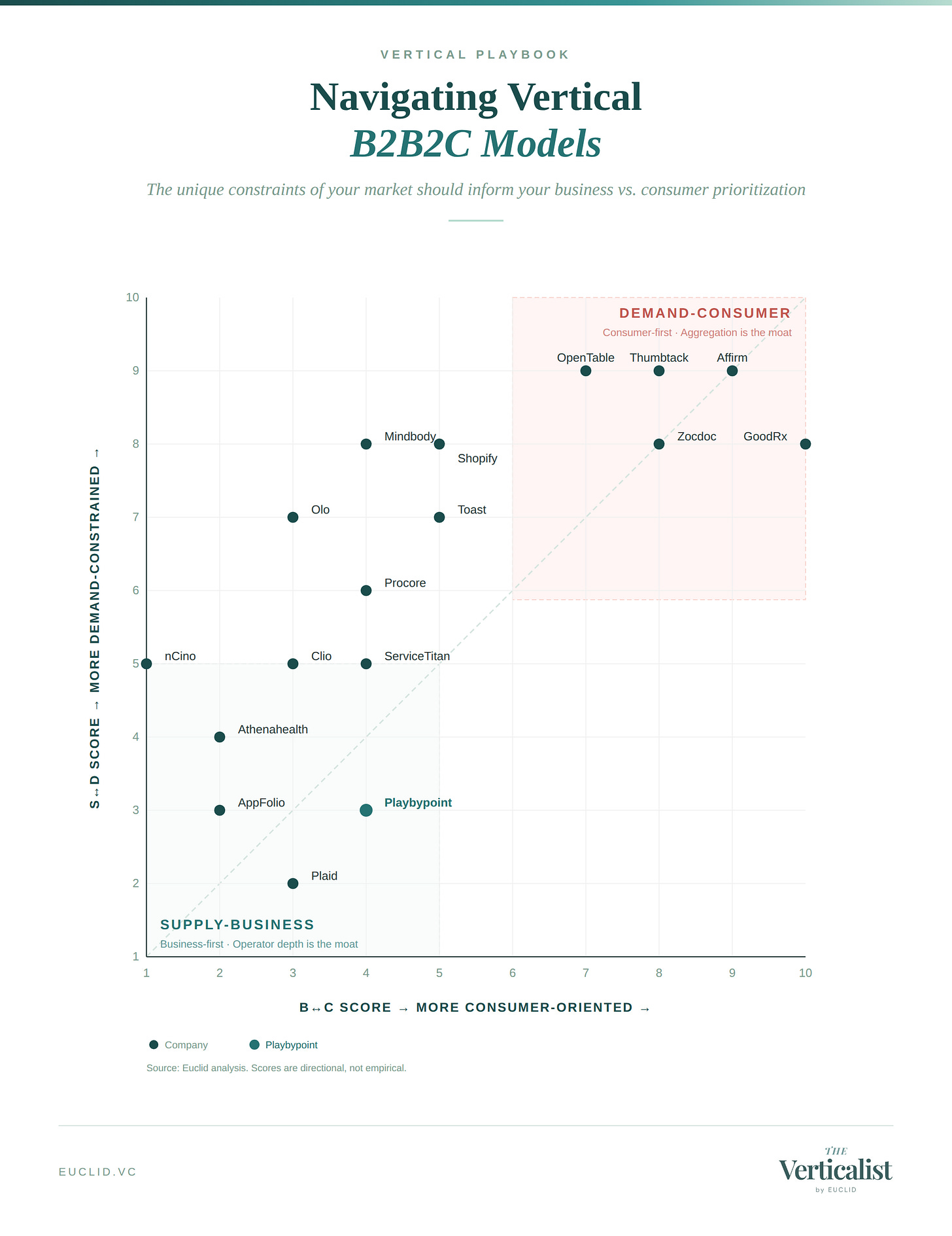 At the other end, Appfolio and Playbypoint are business-first because their markets are supply-constrained: courts are hard to scale, demand for housing is high. Our point is that your B↔C positioning should be informed by whether your vertical is supply- or demand-constrained. Andres understood this instinctively — here’s how he built a strategy around it.