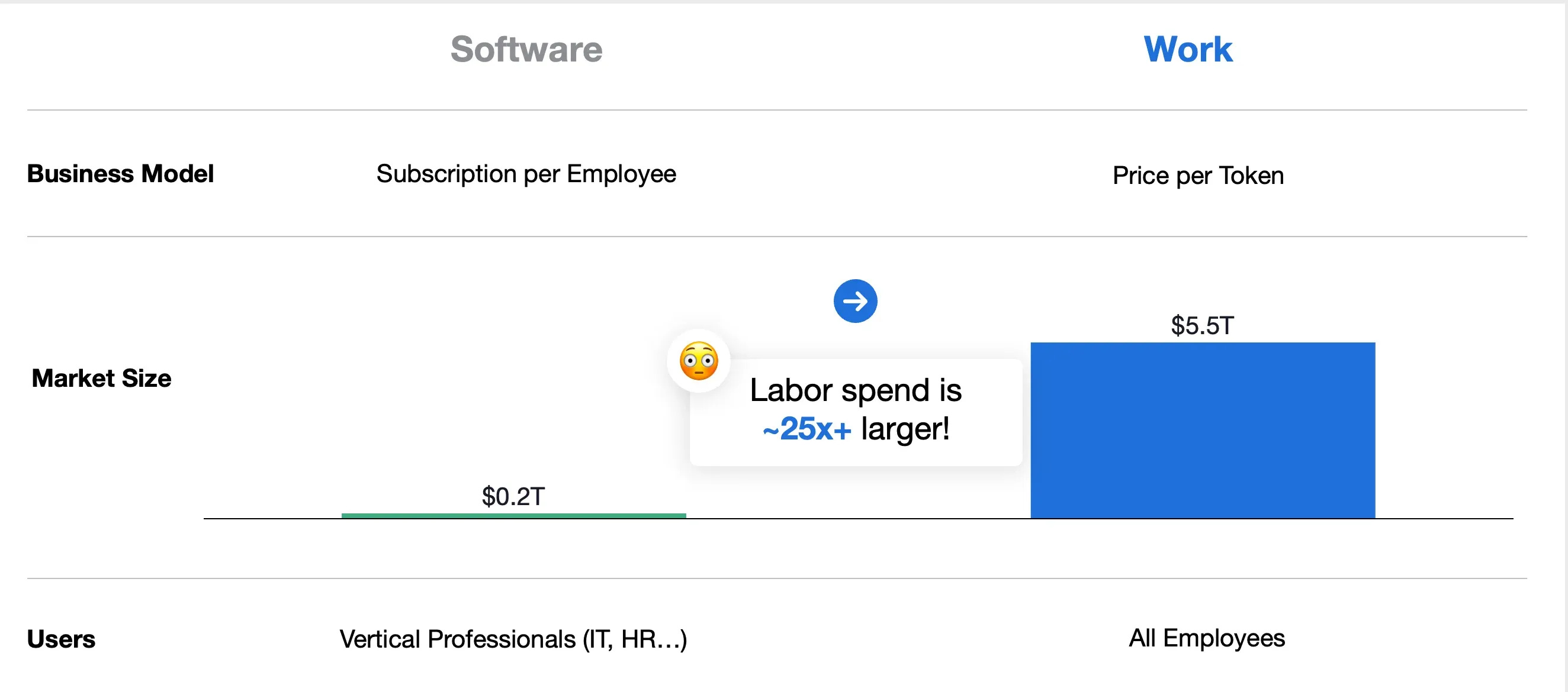 These types of TAM analyses feel overly simplistic. We’ve previously discussed our view that VCs struggle with sizing vertical markets, but this kind of analysis, encompassing all labor spend, is not exclusive to vertical markets. As we explained in our piece on agents in Vertical AI, automation has not historically led to a one-to-one replacement of labor. Similarly, calculating TAM based on potential labor offsets is not only flawed—it’s fundamentally incorrect and incongruous with every historical example of automation.