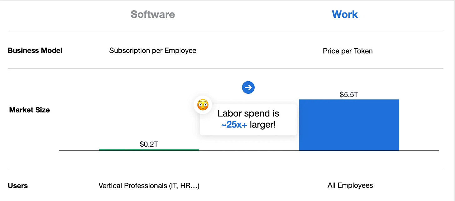 The largest challenge we have with the services narrative is around market sizing. Sequoia’s analysis suggests “the total addressable market for autopilots is all labor spend in a category, insourced and outsourced combined.” Of course, such proclamations are not unique. The graphic below is from a recent Coatue presentation, suggesting that “by shifting the unit of value from the tool to the results, the addressable market potential expands by 25x.”
