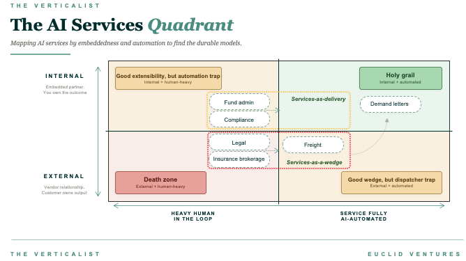 At Euclid, questions remain whether the services-as-a-wedge model will actually prove to be a valuable long-term market entry point. Our friends at Tidemark have done great work on the patterns of control points in Vertical Software. Most vertical software markets have one or two control points that serve as ideal patterns for building strategically dominant Vertical Software companies. In a past piece, we shared what we believe is the optimal control point for most AI-native vertical products: an authoring layer (i.e., launch point) for a valuable internal workflow that can unlock revenue and deliver immediate ROI. For services-as-a-delivery startups, there’s a strong argument that their last-mile coordination layer can serve as a useful control point into larger work-streams and revenue streams. We are, however, more skeptical that services-as-a-wedge businesses can capture ownership of a control point.