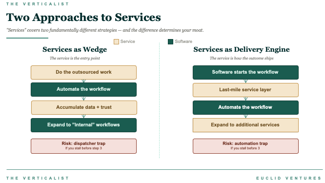 Services-as-a-Wedge relies on “intelligence arbitrage.” Its fundamental bet is rapid AI improvement, allowing what was once a low-margin service to become a software-like business with a low marginal cost of growth. In contrast, Services-as-Delivery-Engine leverages “coordination advantage,” where advances in the AI model drive a product superior to the status quo, even if the margin profile never looks SaaS-like. The former transitions quickly into additional services before it becomes commoditized, while the latter strengthens its advantage through automating exception handling and coordination.