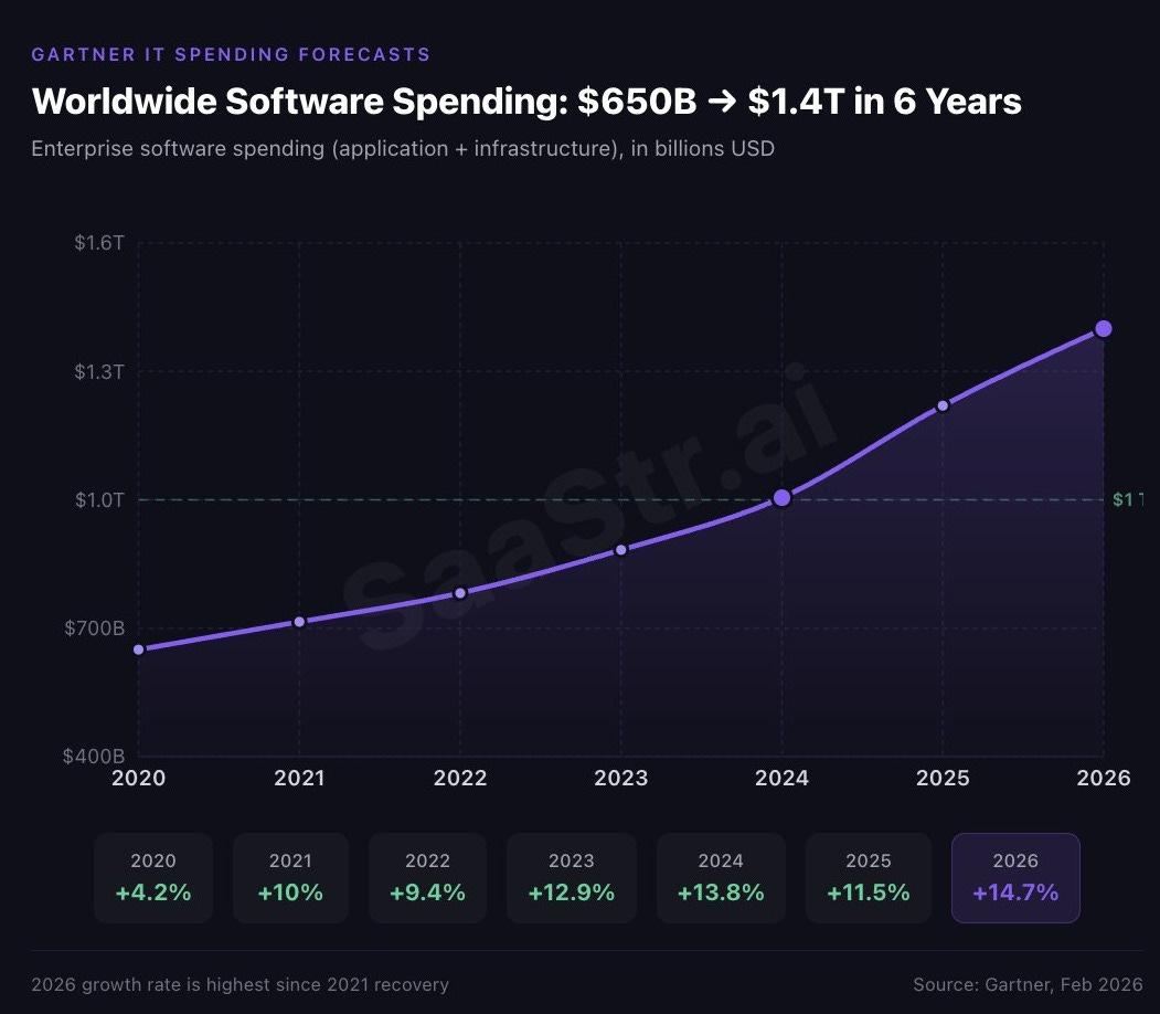 We’ve seen this exact movie before, and recently. Remember when the shift from on-premise to cloud was supposed to kill the enterprise software giants? Oracle, SAP, and Microsoft were all declared dinosaurs — legacy vendors that would be disrupted by nimble cloud-native startups. Instead, the successful incumbents pivoted by buying and building cloud businesses; today, they are bigger than ever. Microsoft’s revenue rose from $62B in 2010 to $282B in 2025. Oracle went from $12B to $57B over the past two decades; its cloud software business is 3x larger than the on-premise business ever was. The on-prem-to-cloud shift certainly killed many incumbents, but more importantly, it supercharged the growth of the enterprise software market. Cheaper to build, cheaper to sell, and cheaper to maintain is deflationary but also market-expanding. Global software markets were ~$200B twenty years ago; today, they're more than five times that size.