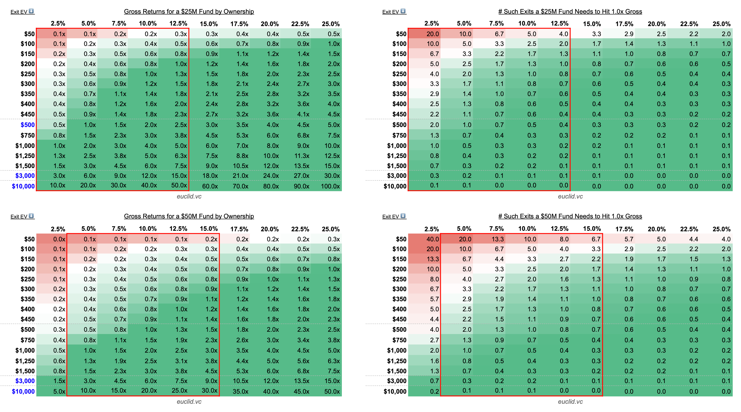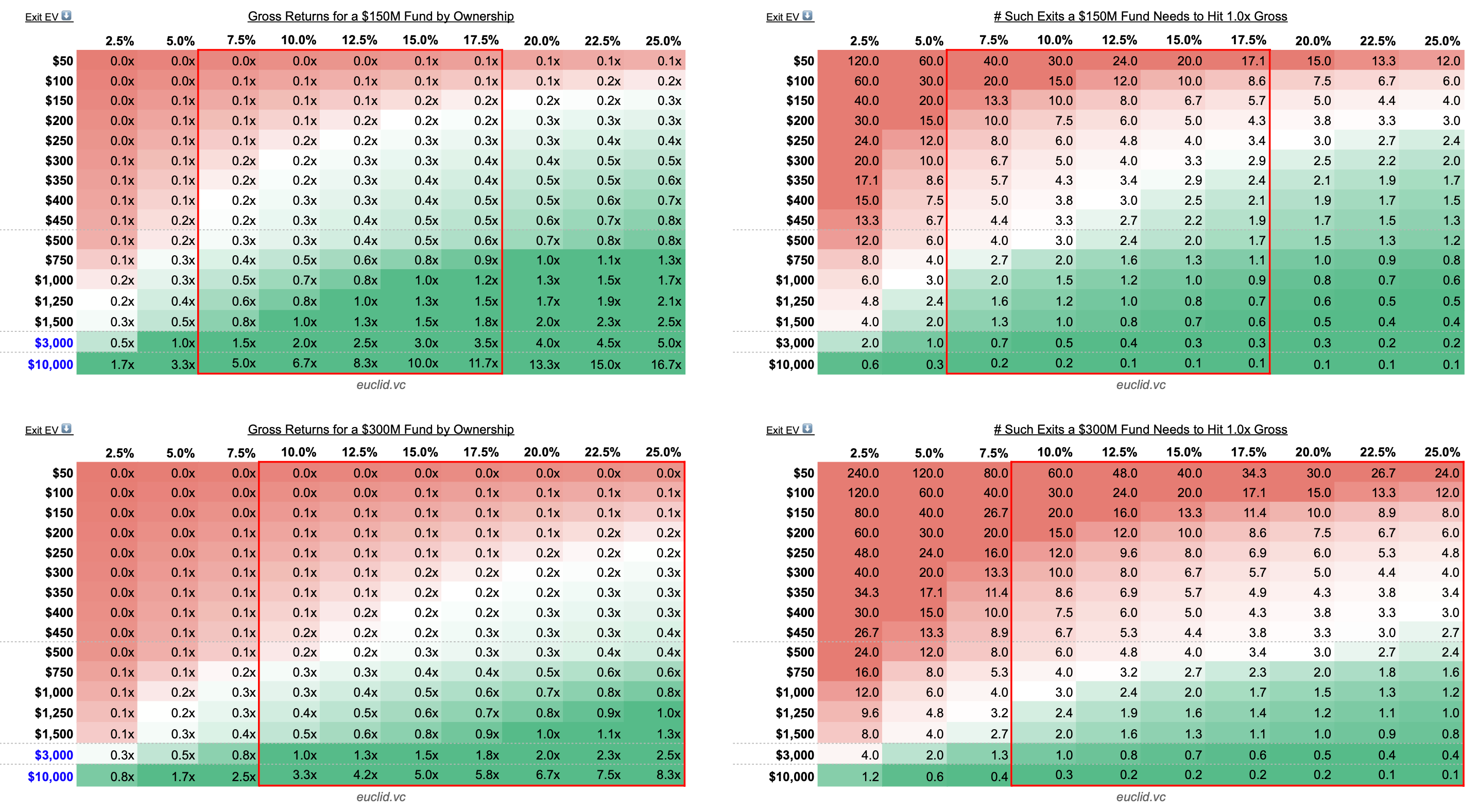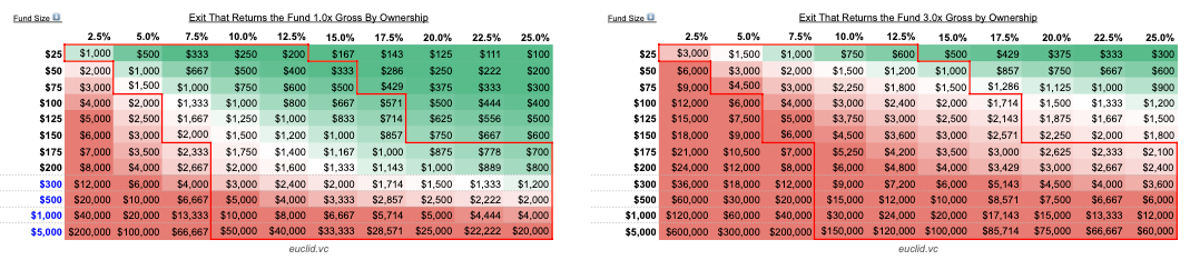 More context on the heat-mapping: dark green band represents a 1x+ return of the fund—it only takes 1 (or fewer) of such deals to return the whole thing. Naturally, VCs care about those the most. The closer you get to red in the heat map, the more the deal profile becomes untenable for the fund—they’d just need too many of them to drive good returns. It’s a proxy for how much the GP should care about such deals, given their size and ownership.