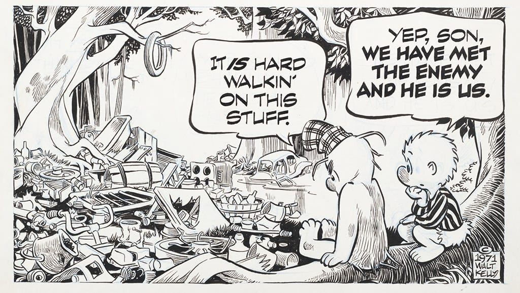 You may recognize the title of this essay from the influential Kauffman Foundation essay from 2012, but it actually originated in Pogo, the comic strip by American cartoonist Walt Kelly. The phrase traces back to naval commander Oliver Hazard Perry’s famous dispatch during the Battle of Lake Erie in the War of 1812: “We have met the enemy and they are ours.” Kelly reworked the iconic line for an anti-pollution poster in 1970 and again in a 1971 Earth Day strip. Since then, it has endured as a potent reminder that the greatest threats we face rarely come from an external “enemy” — they so often come from ourselves.