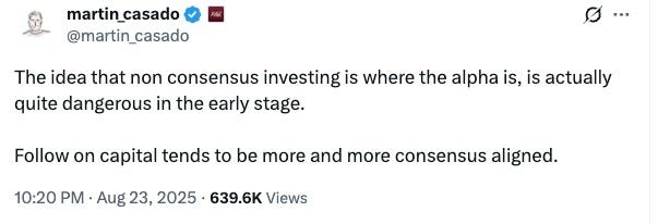 There was also an interesting, relevant Twitter exchange a few weeks ago after a16z GP Martin Casado suggested that there is little to no alpha in non-consensus early-stage investing: