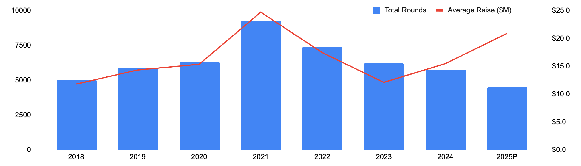 The impact of the “Consensus Power-Law” is an increasingly concentrated venture capital market, even at the earliest stages. Fewer investments, larger deal sizes, and extreme valuations align around box-checking assets. The total number of venture capital rounds raised in 2025 is on pace to be the lowest in nearly a decade, while the average capital raised per company is nearly at the 2021 highs.